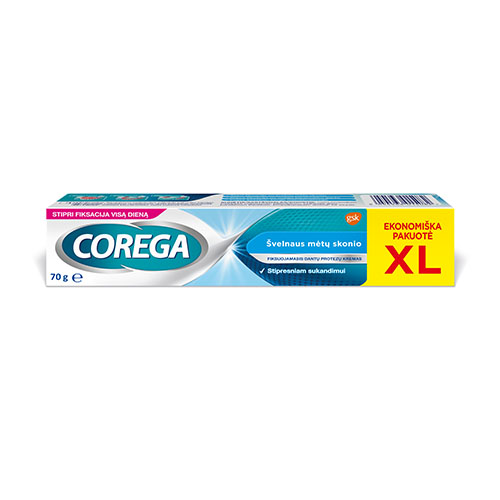 Fiksuojamasis dantų protezų kremas švelnaus mėtų skonio stipri fiksacija visą dieną COREGA 70 g