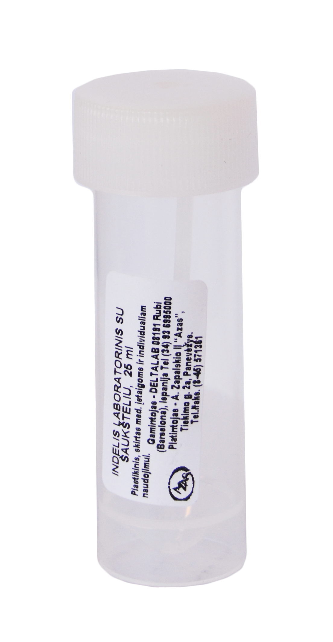 Plastikinis laboratorinis indelis fekalijoms su šaukšteliu 25 ml