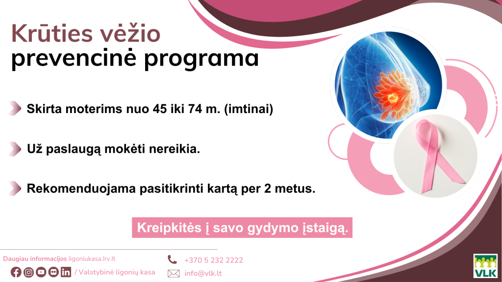 Krūties vėžys yra dažniausia onkologinė liga tarp moterų ne tik Lietuvoje, bet ir visame pasaulyje. Kasmet pasaulyje šią diagnozę išgirsta apie 2,3 mln. moterų. Kuo anksčiau ji diagnozuojama, tuo didesnė išgijimo ir visaverčio gyvenimo tikimybė – neretai ji siekia net 90 proc. Štai kodėl labai svarbu atsakingai dalyvauti krūties vėžio prevencinėje programoje.