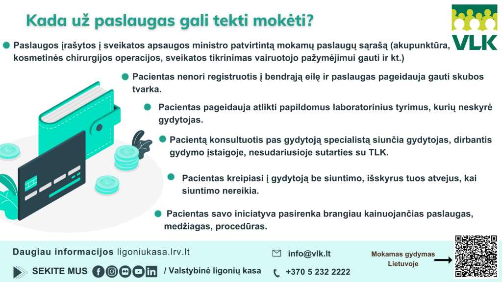 Papildomai mokėti gaunant ligonių kasų apmokamas paslaugas gyventojams dažniausiai tenka, kai jie kreipiasi dėl gydytojų specialistų konsultacijų, vaikų pirminės odontologijos paslaugų, pavyzdžiui, ėduonies, pulpito gydymo, dantų akmenų nuėmimo, dantų ar jų šaknų traukimo, ėduonies profilaktikos, taip pat dienos chirurgijos sąlygomis atliekamų operacijų, brangiųjų tyrimų, pavyzdžiui, magnetinio rezonanso, ir tyrimų, priskirtinų šeimos gydytojo kompetencijai, pavyzdžiui, C reaktyvaus baltymo (CRB) ir kt.