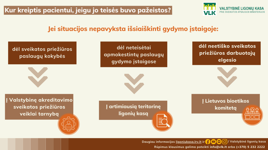 Esant neaiškumų dėl gydymo įstaigoje teikiamų paslaugų, mokėjimų ar specialistų, pacientai pirmiausia turėtų raštu kreiptis į gydymo įstaigos administraciją. Jeigu gautas gydymo įstaigos atsakymas netenkina, galima kreiptis į už konkrečią sritį atsakingas valstybės įstaigas, kartu pateikiant ir netenkinantį gydymo įstaigos atsakymą. Klausimus dėl nepagrįsto pacientų apmokestinimo sprendžia ligonių kasos. Nustačiusios, kad pacientas apmokestintas neteisėtai, ligonių kasos apie tai jį informuoja ir įpareigoja gydymo įstaigą šias lėšas pacientui grąžinti.