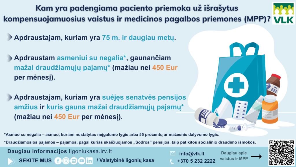 Praeitais metais pusė visų vaistų ir MPP išlaidų sudarė gydymo kompensavimas pensinio amžiaus žmonėms. Tačiau daugiau nei pusei milijono pacientų dėl amžiaus ar negalios lengvatos ir mažų pajamų arba sukaupusiems priemokų krepšelį vaistų priemokos buvo padengtos valstybės biudžeto lėšomis. Tokiu būdu pernai pacientai sutaupė net 35 mln. eurų asmeninių lėšų.