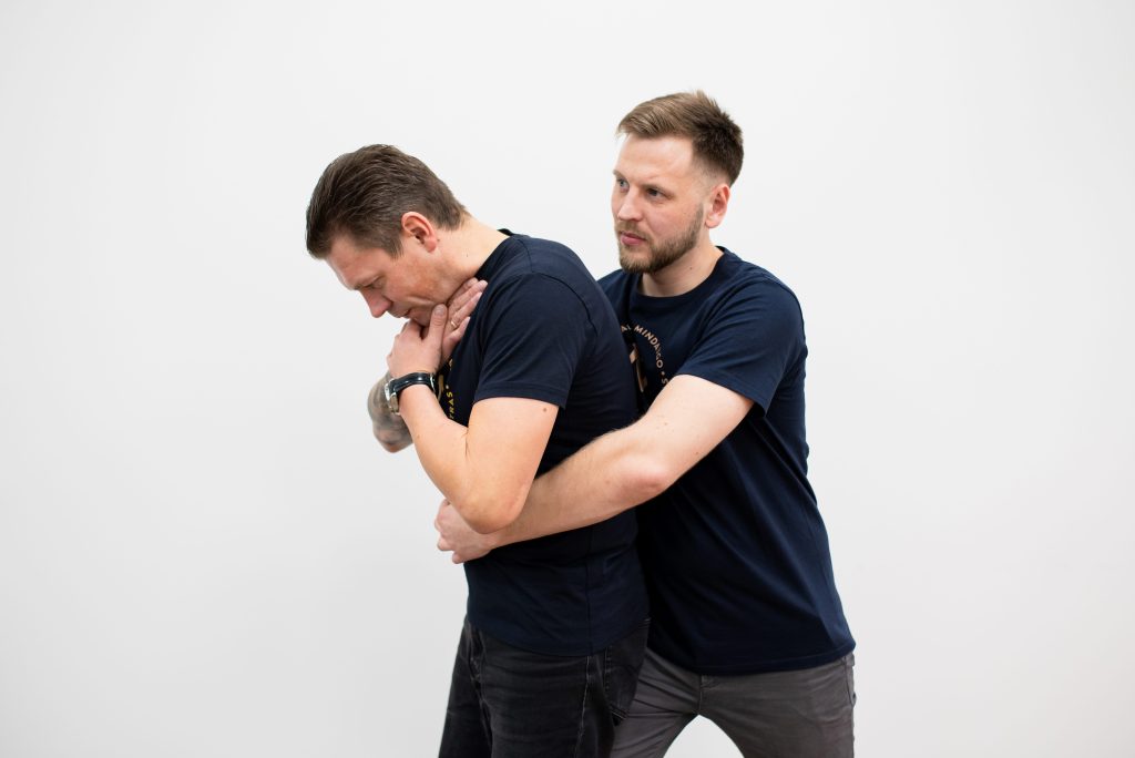 Jeigu užspringus galite kosėti, tai patariama tą daryti kuo stipriau ir kiek palinkus į priekį. Jeigu turite galimybę, kuo greičiau surinkite numerį 112. Dispečerinė nustatys Jūsų buvimo vietą. Jeigu kosėjimas nepadeda ir darosi blogiau, atlikite Heimlicho manevrą sau patys. Vienos rankos kumštį nykščiu į priekį uždėkite ant epigastrio srities, tada kita ranka suimkite už savo kumščio ir staigiu judesiu visu kūnu trenkitės į šalia esantį stabilų objektą.