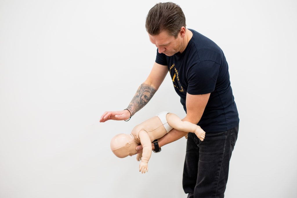 Esant daliniam kūdikio užspringimui, skatiname jį kosėti ir stebime būklę. Jeigu kūdikis nustojo kvėpuoti ir pradeda mėlti, paguldome jį pilvu ant savo rankos dilbio ir prilaikant apatinį žandikaulį, atliekame 5 smūgius į tarpumentę. Tuomet apverčiame kūdikį ant kitos rankos ir galvą laikydami šiek tiek žemiau dviem dešinės rankos pirštais atliekame 5 krūtinės ląstos paspaudimus. Jei po šių veiksmų kūdikis neatspringo, kartojame veiksmus iš naujo. Jeigu kūdikis praranda sąmonę, nedelsiant skambiname 112 ir atliekame pradinio gaivinimo veiksmus.